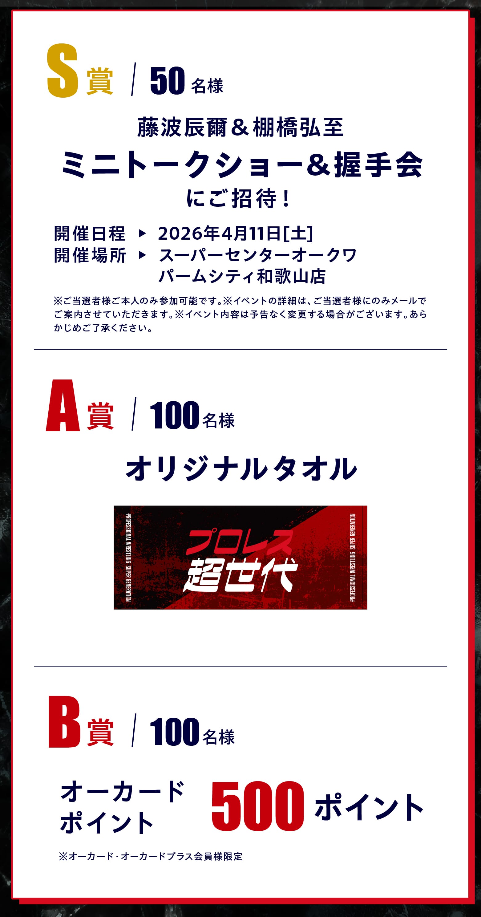 抽選で藤波辰爾&棚橋弘至 ミニトークショー&握手会ご招待やオリジナルタオル、オーカードポイントをプレゼントいたします。